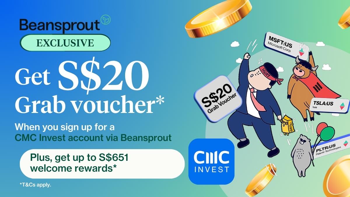 Get a free S$20 Grab voucher when you sign up for a CMC Invest account via Beansprout. Also, receive welcome rewards worth up to S$651 from CMC Invest.